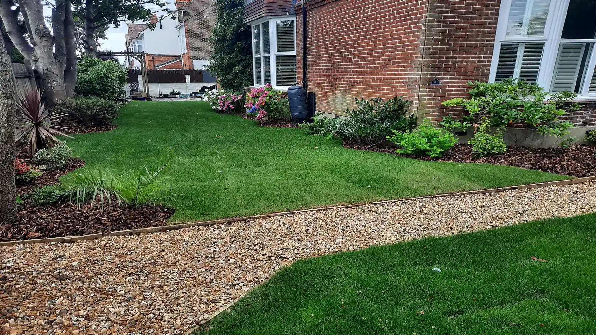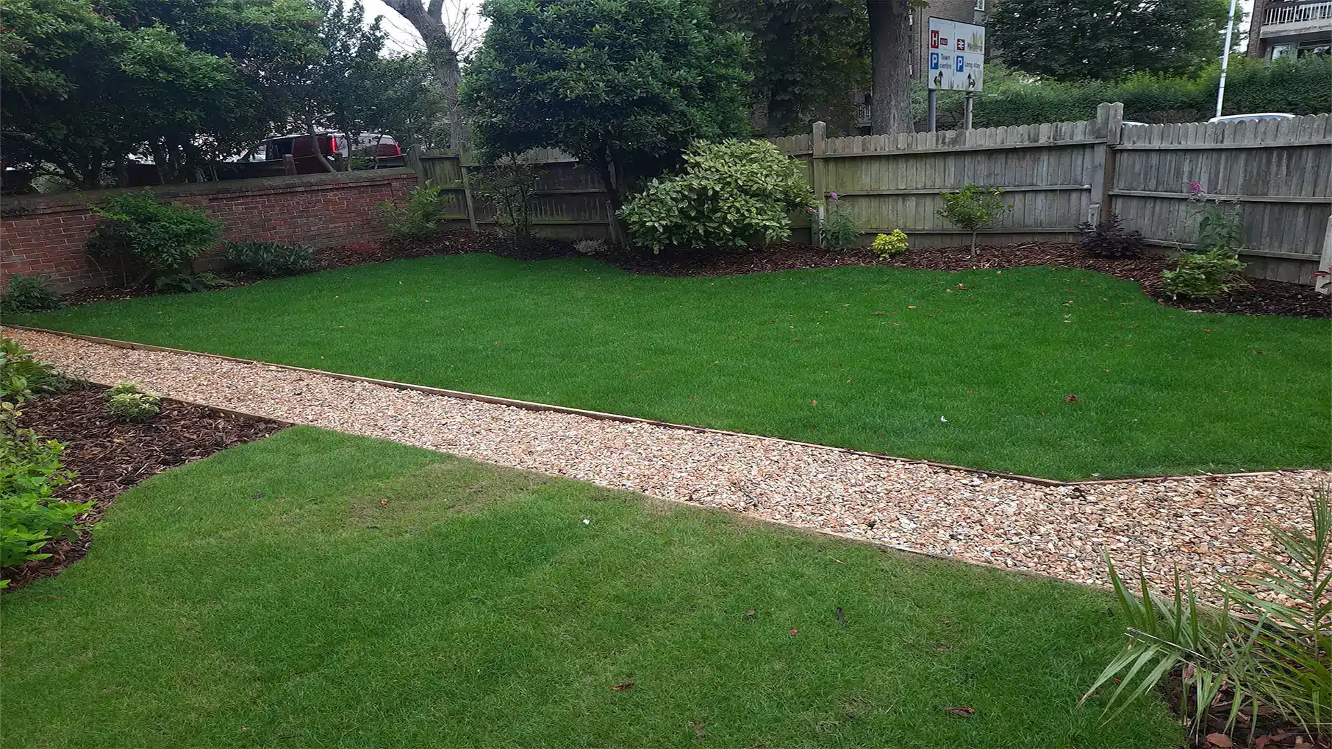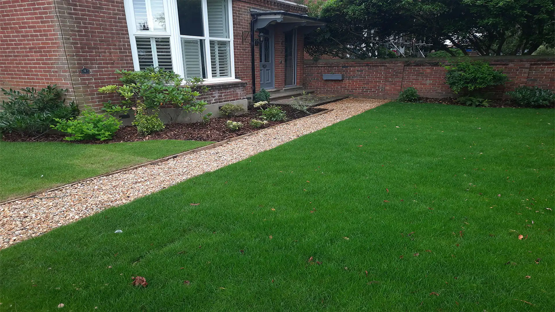 New Lawn with Flower Beds & Gravel Pathway and Planting