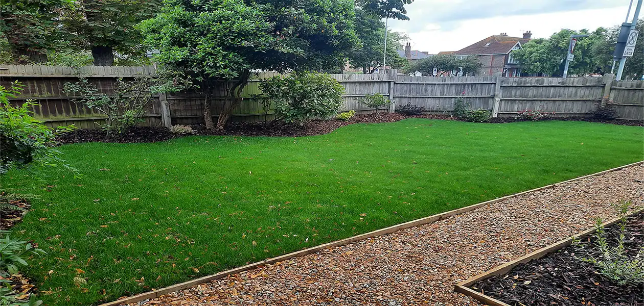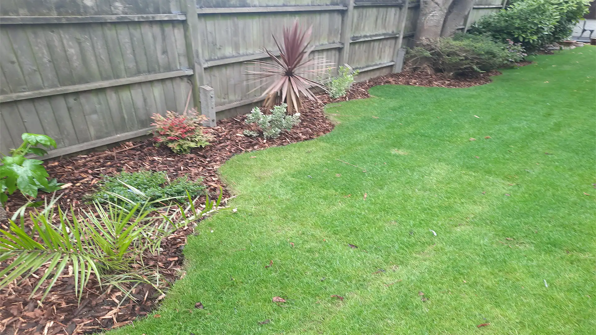 Once the space was clear, it was time for the second stage which was to add a new lawn and flower beds. We took up the existing moss-ridden lawn and replace it with a new layer of topsoil and premium-quality turf. From there, we added plenty of healthy new plants and bark before cutting a stylish curved for the flower beds to finish off the space project nicely.